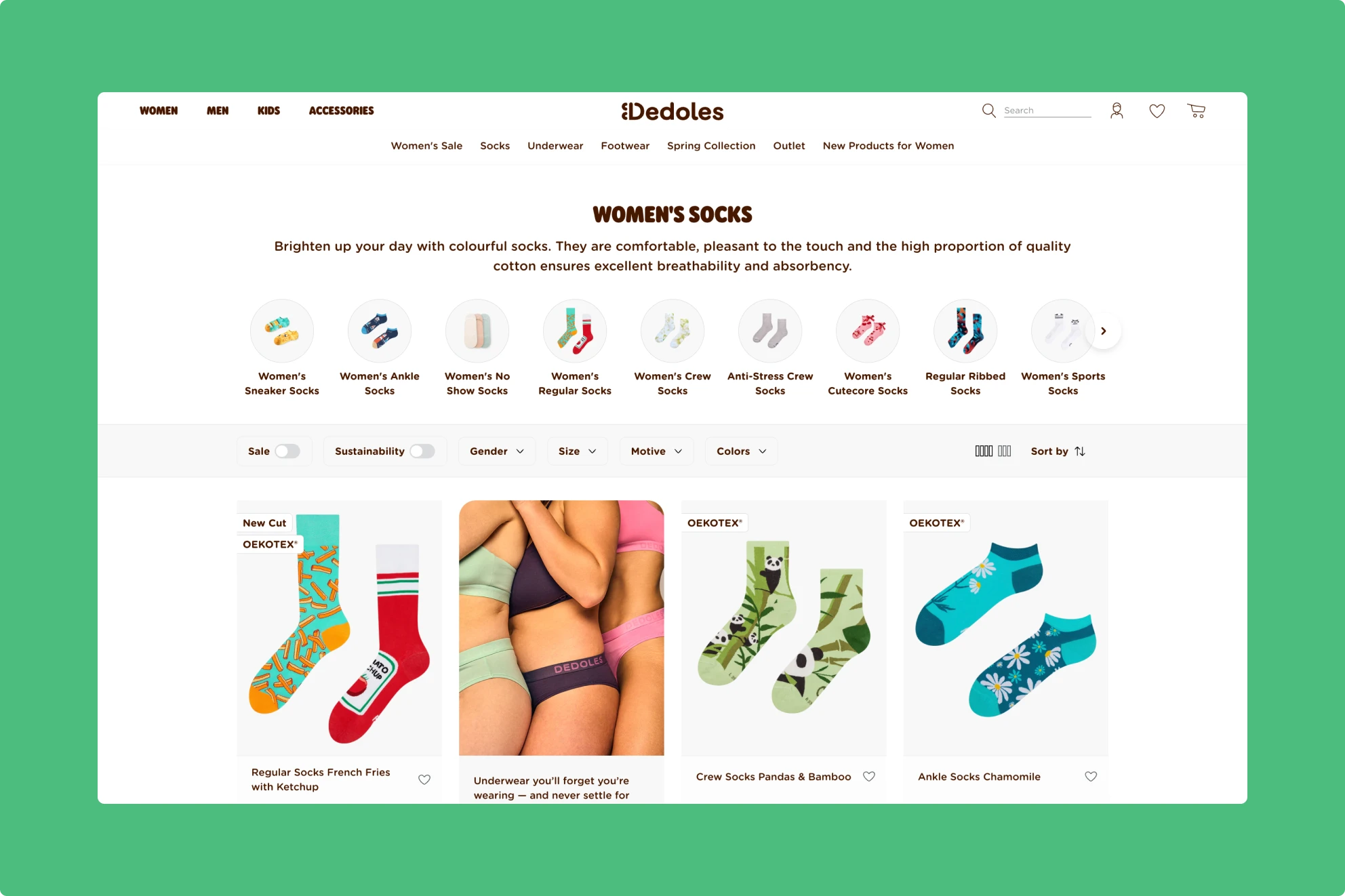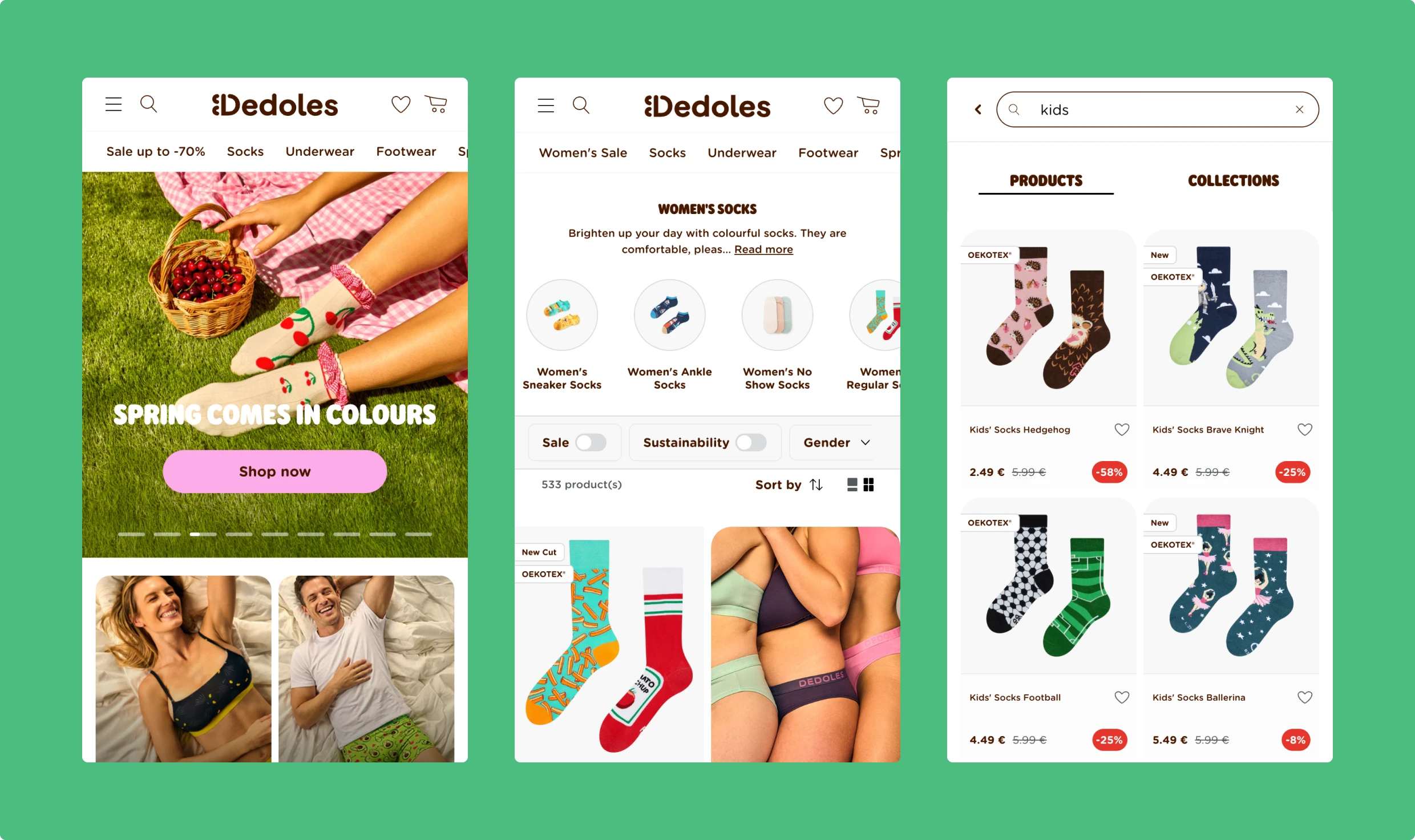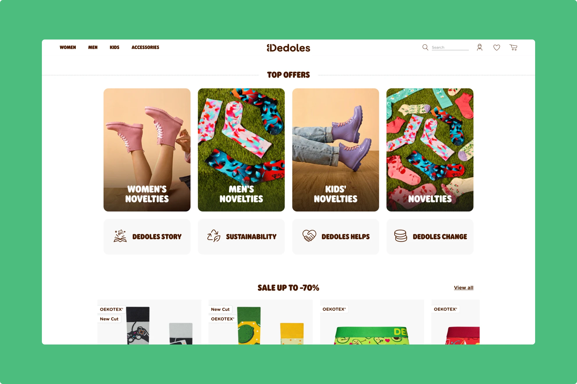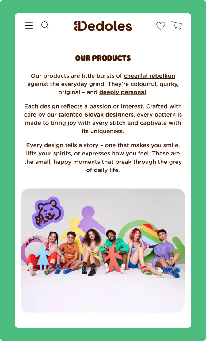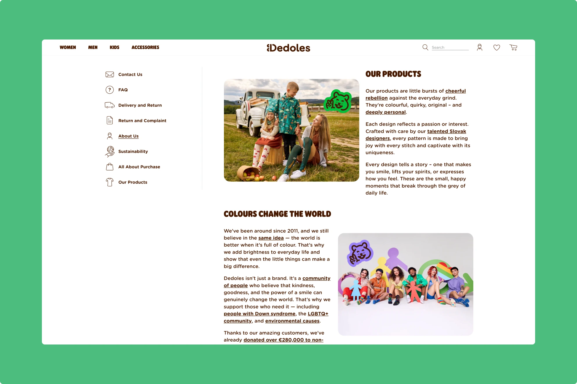 Dedoles šíří radost prostřednictvím originálních designů na svém oblečení. Je to značka, která věří v pestré barvy, lidskost a udržitelné e-commerce praktiky.